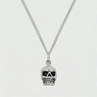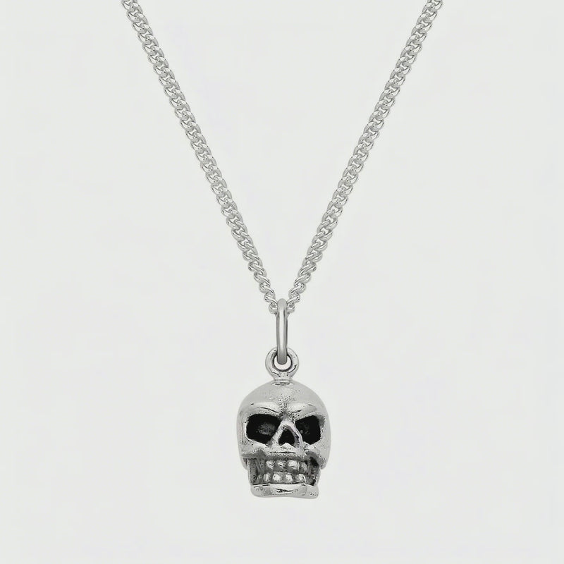 A seriously chunky 3D skull pendant, suspended on a sterling silver chain.